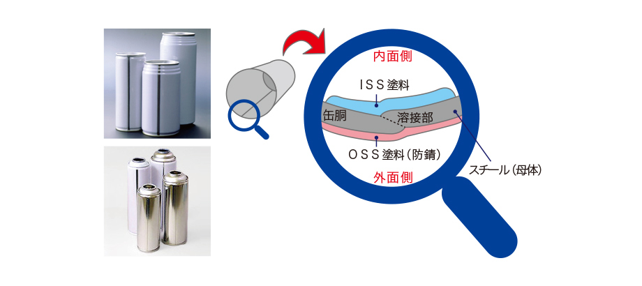 缶胴の接合部(溶接部)では素材のスチールが溶解するのでその表面の酸化が起こり耐食性が低下するため、その部位の腐食を防ぐため内外面とも補正が必要となります。