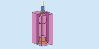 プリフォームを加熱し、金型の中で空気を吹き込んで膨らませてボトルに成形します。